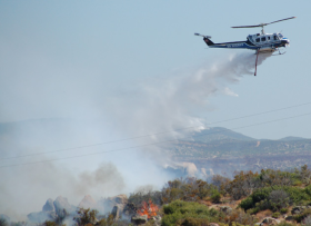 “Currently we have 8 Engines, 2 Fire Crews, 2 Water Tenders, 1 Bulldozer, 2 Airtankers, 2 Helicopters, and 2 Chief Officers, which is approximately 100 firefighters,” said Cal Fire spokesperson Roxanne Provaznik. “The fire is burning uphill to the south, and spreading slowly. There is one outbuilding and one power pole on fire.”