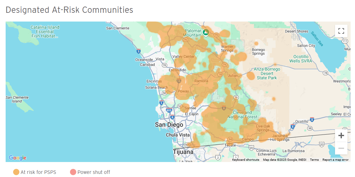 Communities at risk of outages in San Diego County include the Barona reservation, Borrego Springs, the Campo reservation, Capitan Grande reservation, Cardiff, Chula Vista, Del Mar, El Cajon, Encinitas, Escondido, Fallbrook, Granite Hills, Jamul Indian Village, Julian, La Jolla Reservation, Lakeside, La Mesa, La Posta reservation, Lakeside, Los Coyotes Reservation, Manzanita reservation, Mesa Grande reservation, Pala,