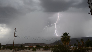 Update: The fire is now out but the roadway remains flooded and there are many other hazards. Lightning strikes are reported in the Warner Springs area and other locations including the bolt shown at left, taken by Bob Kutscher. This strike apparently ignited the fire, with smoke visible on a second image moments later shot from Borrego.