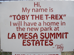 The La Mesa Summit Estates will feature a new community park. Upon completion of the subdivision, Toby will be moving to the new park, where he will continue to welcome dinosaur lovers of all ages.
