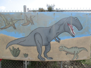 Since taking up residence on his hilltop look out, Toby has become a popular east county attraction. He dresses up in holiday attire. Santa Claus at Christmas. A leprechaun on St. Patrick’s Day. An Easter bunny. A ballerina on Halloween. Uncle Sam on the 4th of July. The young students at the nearby La Mesa Arts Academy started a Toby The T-Rex fan club and painted murals of him.