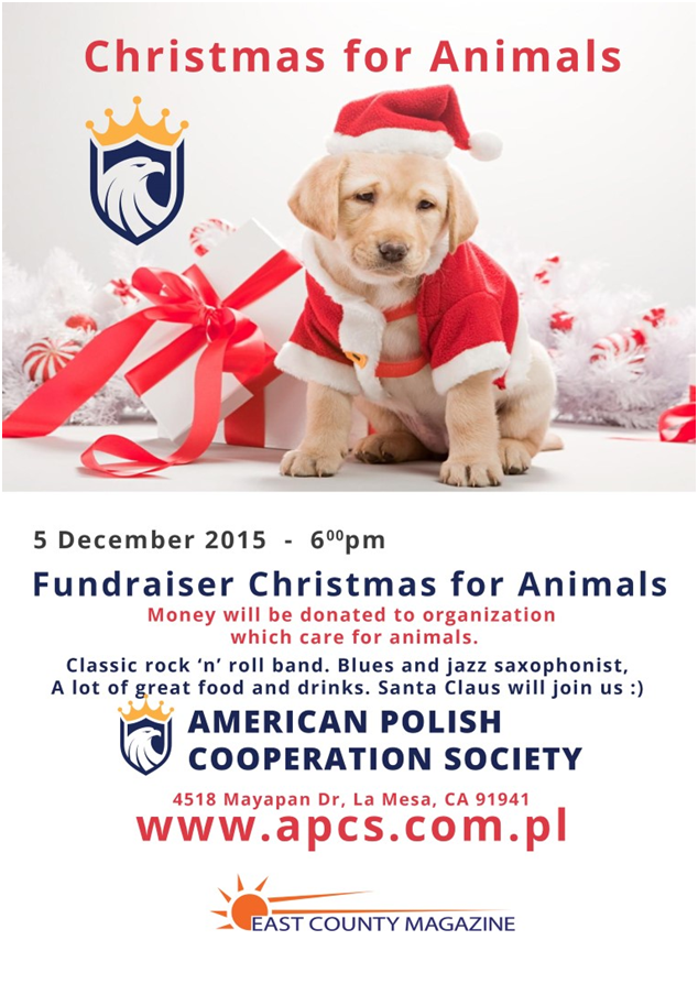 The party is at 4518 Mayapan Drive in La Mesa at the home of a wonderful benefactor, hosted by the American Polish Cooperation Society. Proceeds will benefit local animal rescue organizations as well as helping East County Magazine start a new special Animals Action section.