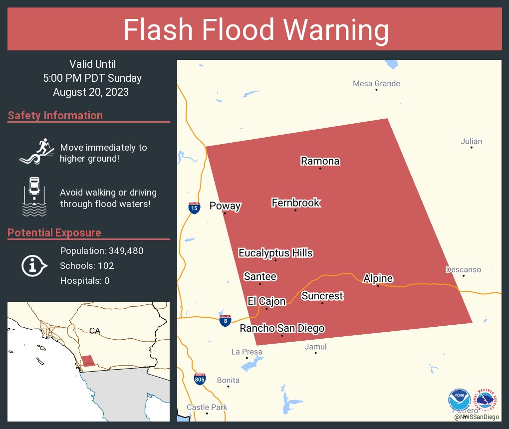 August 20, 2023 (San Diego's East County) --The National Weather Service has issued a flash flood warning now through 5 p.m. for El Cajon, La Mesa, Poway, Ramona, Alpine, Tierrasanta, Escondido, Santee, Lakeside and San Diego Country Estates. This is due to heavy rainfall capable of producing life-threatening flash floods.