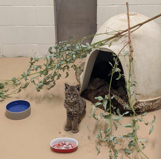 The 6- to 8-month-old bobcat arrived at the Ramona Wildlife Center on Oct. 13, 2020, after a call by the California Department of Fish and Wildlife (CADFW). The warden explained that a citizen from Yucaipa had been out with her dogs when the dogs spotted the bobcat. The dog owner was able to get between the animals to prevent any injuries. The cat was then taken to a veterinary clinic in Grand Terrace. The cat was so growly that veterinary staff hesitated to open the carrier and instead contacted CADFW. Staff at San Diego Humane Society’s Project Wildlife confirmed it was a bobcat by looking at photos and identifying the markings on the animal.