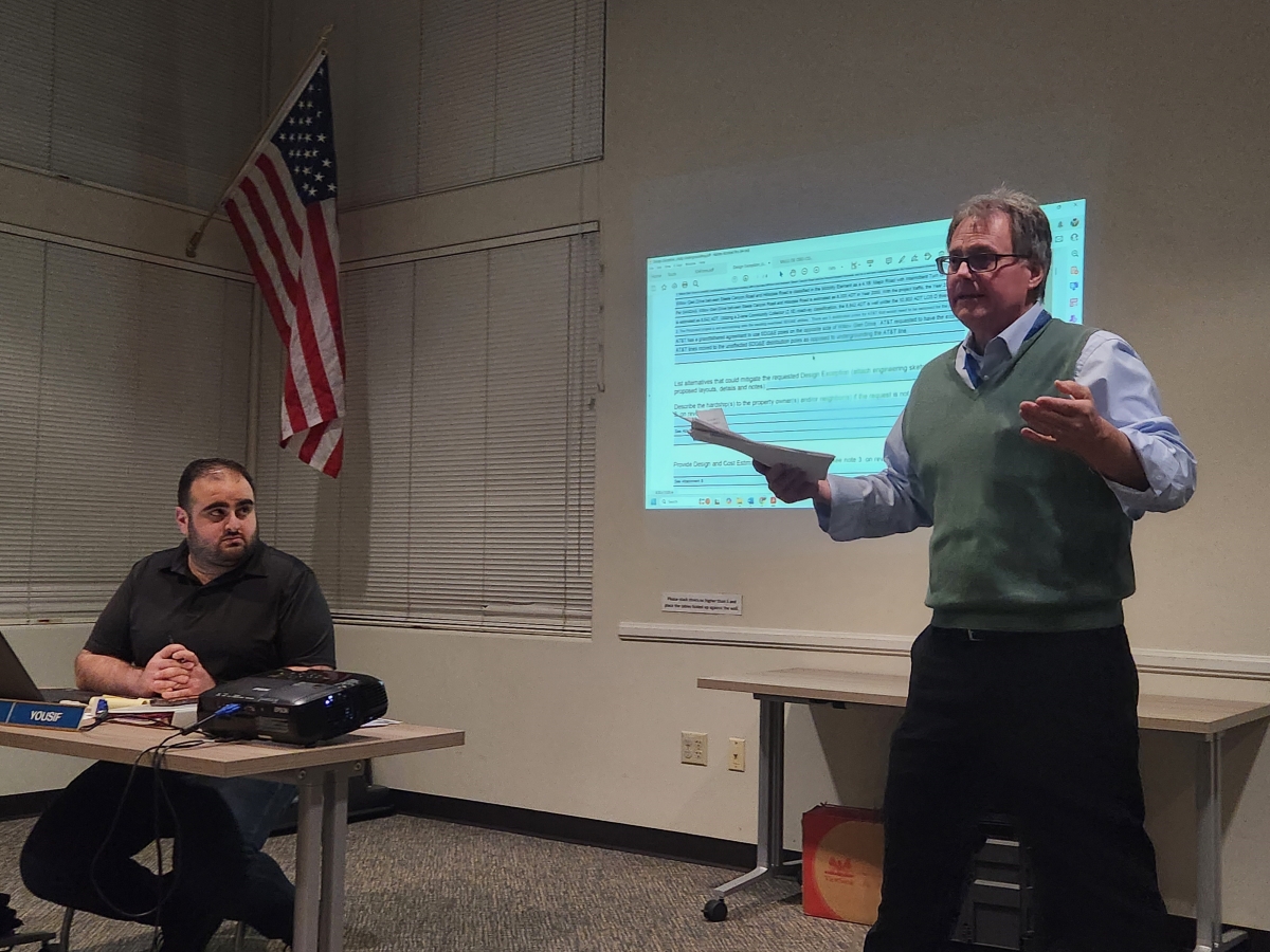 Photo, right: Valle do Oro Community Planning Group Chair Oday Yousif, left, looks on as County Land Use Planner Chris Jacobs gives presesntation.