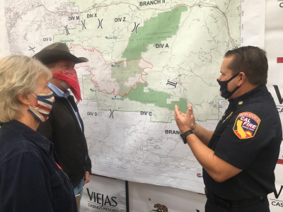 Photo, left by Henri Migala: Cal Fire/County Fire Chief Tony Mecham briefs Supervisor Dianne Jacob and supervisorial candidate Steve Vaus after press conference today at Viejas