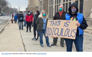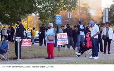Photo, left: Masked voters during pandemic protest long lines; CC by NC-ND via Bing
